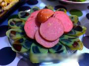 锅里放水 水热后放入灌好的肠 控制温度不要开锅 一直用小火慢煮并时常翻个。 出锅后放凉 凉了才会很有筋道哦
