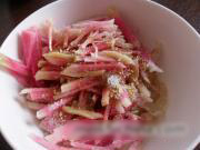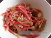 洗净的海蜇丝放入大碗里,加入萝卜丝。