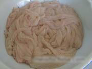 猪小肠一付,摘掉外面的猪油,刮去里面的油,用白醋、碱面分别浸泡、揉搓,去除腥味,里外清洗干净,控干水分,备用。这一步十分麻烦,也很关键。