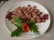 灌香肠的必备工具:剪刀、干净的棉线绳子、小饮料瓶儿。饮料瓶从三分之一处剪开,猪小肠一头用绳子扎紧,另一头套在瓶子口,用筷子将腌好的肉丁慢慢灌入,装满填实一段用绳子扎住隔开。这一步需要两个小时。因为我和老公满手是油忙乎,本环节无照片。