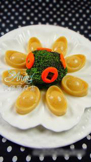 皮冻成型后取八个脱模,将西兰花摆成摇钱树,将金币放在摇钱树的四个方向。