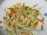 将过好凉的金针菇用手攥去水分,放入大碗中备用将青尖椒切成小条,胡萝卜、黄瓜擦成丝,大蒜切碎一同放入碗中。