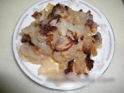 泡制好的海蜇头,洗干净后顺着蜇瓣切成小片,装盘备用