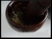 把蒜放蒜臼里捣碎。