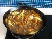 然后加老抽,酱油,蚝油,美极鲜,盐,五香粉,水(要没过猪皮),葱段姜片,大火烧开。