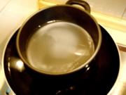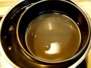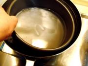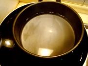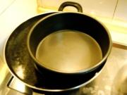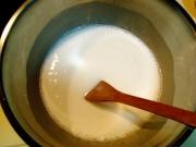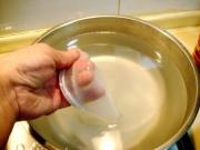 把汤锅中的水烧开,改成小火使之微开即可,温度保持在摄氏95度以上就行。舀一勺淀粉浆倒入蛋糕盘,把蛋糕盘蹲入开水中。