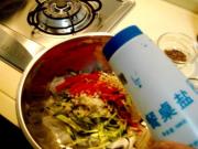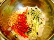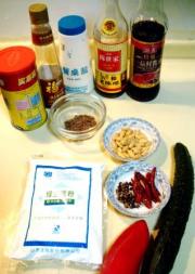 绿豆淀粉150克、清水300ml、盐5克、黄瓜200克、红尖椒60克、干辣椒10克、花椒3克、五香花生米25克、鲜酱油10克、鸡粉3克、香醋15克、香油5克、花生邮20克。制作工具;汤锅、凉水盆、蛋糕模。
