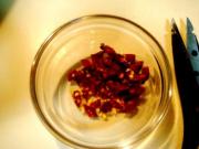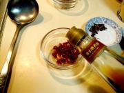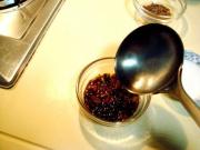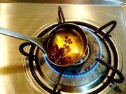 花椒油炸好后,趁热分次倒入干辣椒碗中,边倒边搅拌,炸好辣椒备用。
