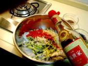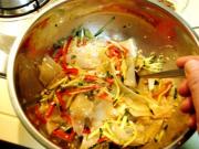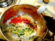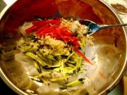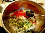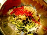 黄瓜和红椒切丝,蒜切末放入盆中。
