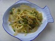 黄瓜切成粗丝;凉粉片成片后切成宽丝。