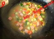 炒出香味后下黄瓜丁、彩椒丁、火腿丁、玉米粒翻炒均匀。