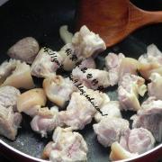入猪蹄煸炒干水份,微变色。