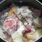 猪蹄洗净,锅里入水放几片姜,少许料酒把猪蹄放进去煮开。