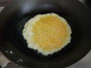 将鸡蛋打散,加适量水后搅匀,锅中油烧热后倒入鸡蛋炒。