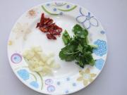 红干椒切碎,蒜拍扁后切末,香菜切末。