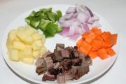牛肉、洋葱、青椒、胡萝卜、土豆统统切成丁。