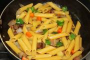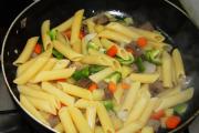等土豆九成熟时,加入通心粉跟青椒,翻炒。