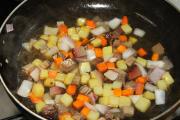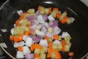 坐锅点火,锅内倒入适量油,将土豆、胡萝卜、洋葱入锅炒。