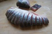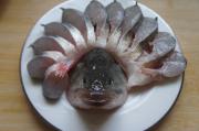 将腌制好的鱼在盘子里摆出孔雀开屏的姿势。