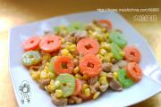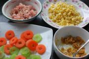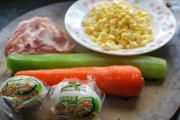准备食材:咸蛋黄2个、甜玉米3两、鸡腿肉2两、胡萝卜、莴笋。