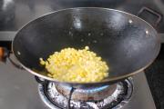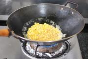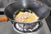 把玉米粒倒入炒好的咸蛋黄锅中均匀地翻炒。