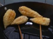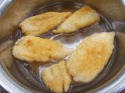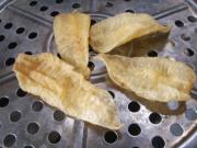 等花胶鼓起发大至1.5-2倍左右,颜色变微黄即可捞起。炸好的花胶推到锅边控干油。