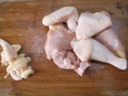 鸡斩成小块,切去一部分鸡油和鸡皮。