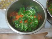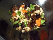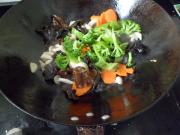 倒入青椒、西兰花和胡萝卜翻炒均匀。