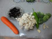 木耳用温水泡发后,摘去根部,洗净,撕成小朵,白玉菇洗净掰成小朵。