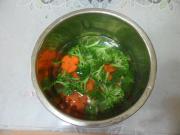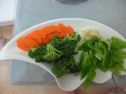 胡萝卜去皮切片,西兰花掰成小朵,青椒切小块,蒜切片。