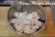 豆腐切成定,用南豆腐或者韧豆腐或者木棉豆腐都不错,北豆腐的话可能不会太好的入味。