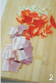 培根切削片,红椒切块、蒜切碎待用。