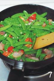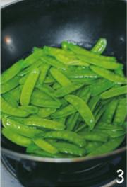 再加入沥干水分的荷兰豆,快炒约2分钟左右后调入适量盐和鸡精翻炒均匀即可。