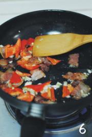 待培根变色后加入红椒煸炒一小会。(注意培根不要炒的太老了,否则硬了口感会差些)