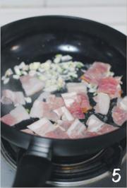锅里放少许油(培根还会出油,所以油少放一点即可),将培根片和蒜末放入煸香。