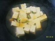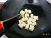 锅内倒入少许油,油热后下入切好的青蒜段和姜片、豆腐小火略煎。