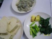 豆腐用淡盐水浸泡半小时后取出切块,海蛎加少许盐、醋、料酒、胡椒粉、地瓜粉拌匀,青蒜切段、姜切片备用。