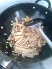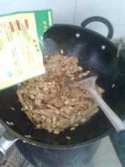 倒入豆芽(不要菜汤,后面用),和刚才的老抽肉片炒匀。