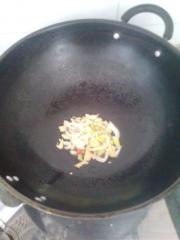 锅里到油,稍热,放入葱丝姜片和干红小辣椒,爆锅,香。