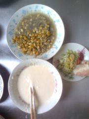 半碗水,边加面粉边搅匀(爱吃咸的可以加点盐),成糊状,稠一点~同时准备好其他材料。