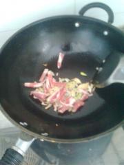 倒入切好的小肉片,翻炒两下,再加入一勺老抽,继续翻炒,8成熟了。
