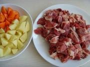 将牛腩洗净去块,土豆、胡萝卜洗净去皮分别切成滚刀块。
