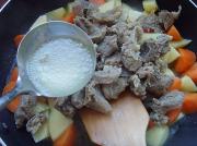 待胡萝卜炒出红油,加入牛腩、煮牛腩的原汤。