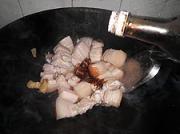 锅热油,放入姜、五花肉,倒入老抽,料酒、盐,翻匀加水。
