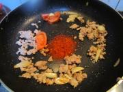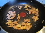 肉末炒开后,加入辣椒粉和两小块西红柿(据说可以防止茄子变黑,无从考证,但是今天的茄子居然没有黑,不知道是不是西红柿的作用)。