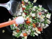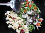 倒入豌豆、胡萝卜、香菇丁翻炒均匀。