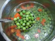 香菇切丁,豆干切丁备用。锅中烧水,水开后将豌豆、胡萝卜丁和香菇丁分别煮至7分熟,捞出。