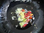 热锅倒油,油热后下葱姜末、干红辣椒段、五香粉爆香。