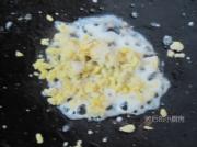 在锅中放入少许的油,加入碾碎的蛋黄翻炒至泡沫出现。