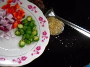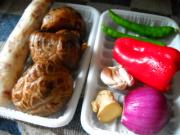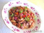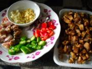 花菇提前泡发好,洗净、切小粒;青红椒、洋葱切小块;香肠切小块;姜蒜切末。